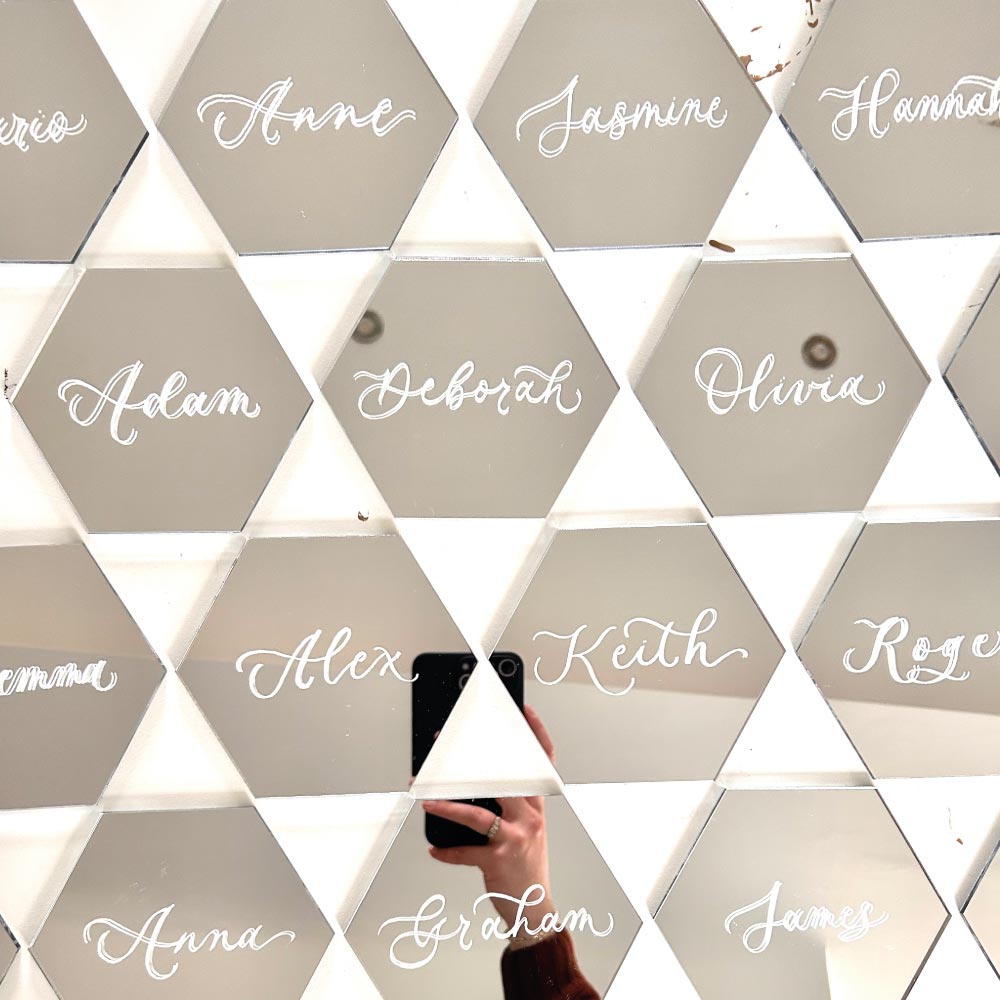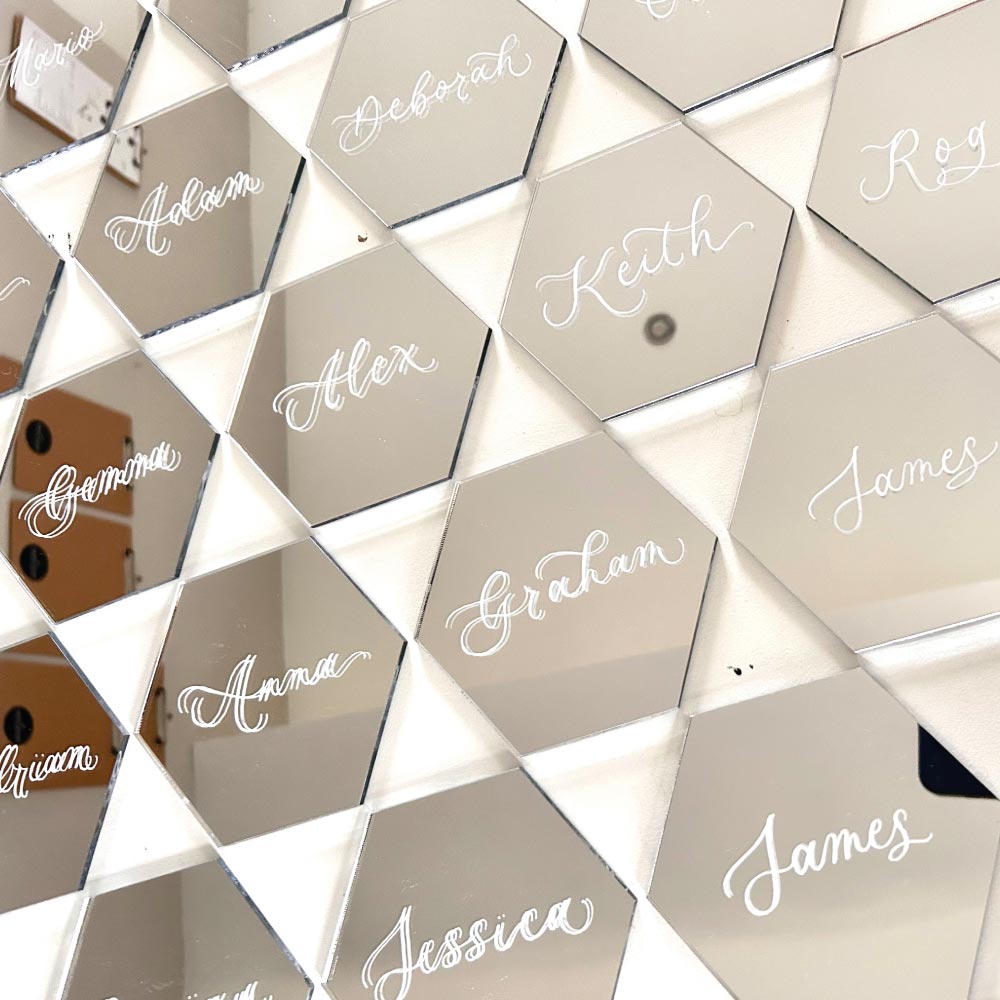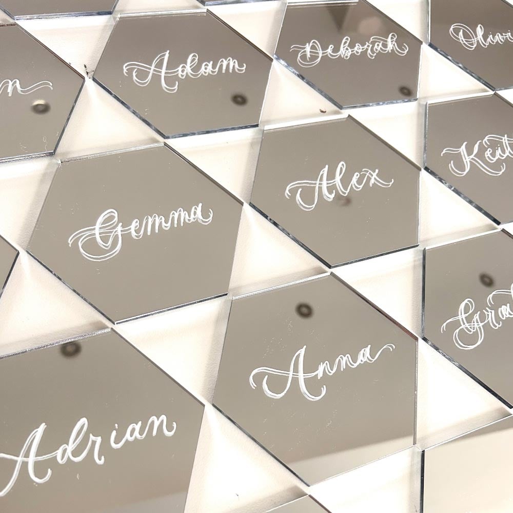 These hexagonal place cards are created on mirrored 3mm perspex and your guest name is handwritten in acrylic white ink to the front.
